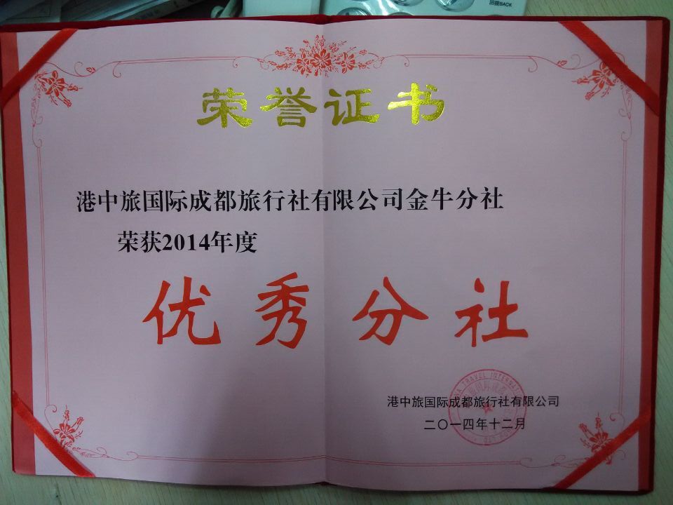 2月4日,港中旅成都旅行社金牛區(qū)分社榮獲港中旅成都旅行社頒發(fā)的優(yōu)秀分社榮譽證書。